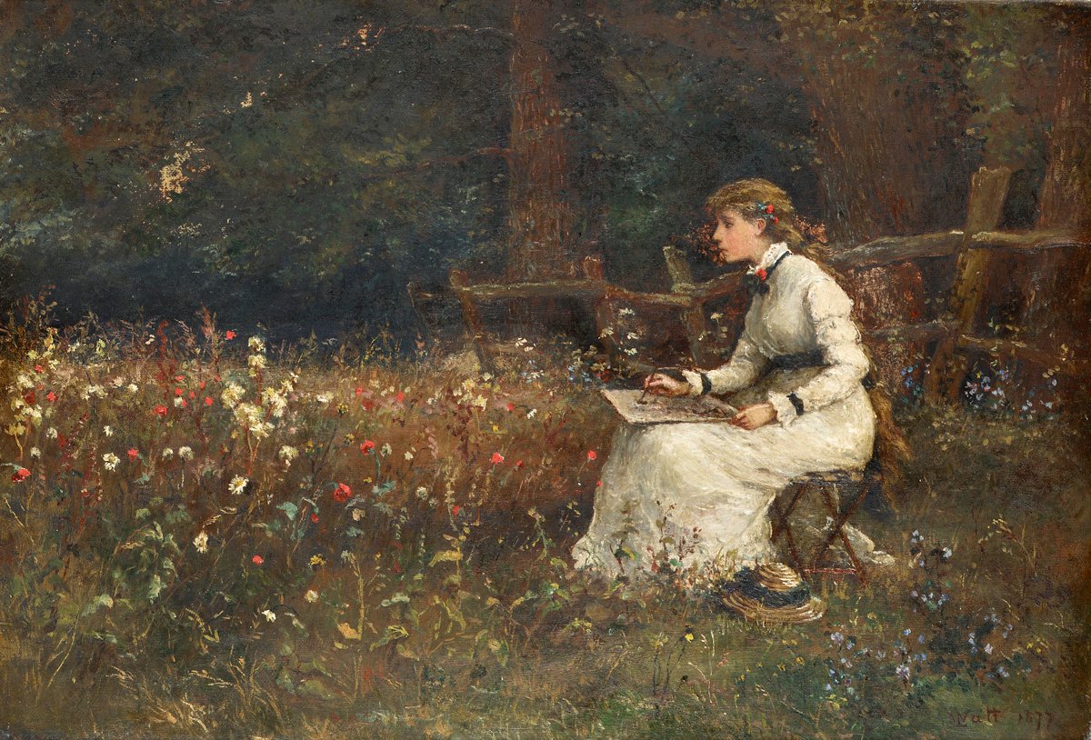 Biografía: Artista inglesa, conocida por sus delicadas imágenes de la campiña inglesa, amenizadas con figuras de niñas o niños ingleses no menos encantadoras, recuerdan, con alguna diferencia, a las delicadas acuarelas de la pintora Helen Allingham. Linnie Watt supo evocar mucho lo característico de la delicada belleza de bosques y prados con un toque expresivo sencillo, especialmente adaptado a sus materiales y al carácter decorativo de su obra. Se la podría incluir entre los artistas del paisaje de no ser por sus figuras, y entre los pintores de figuras de no ser por sus paisajes. Pero es imposible separar una de la otra, pues las figuras no son "introducidas", sino que parecen formar parte orgánica de sus concepciones. © Cosmo Monkhouse |