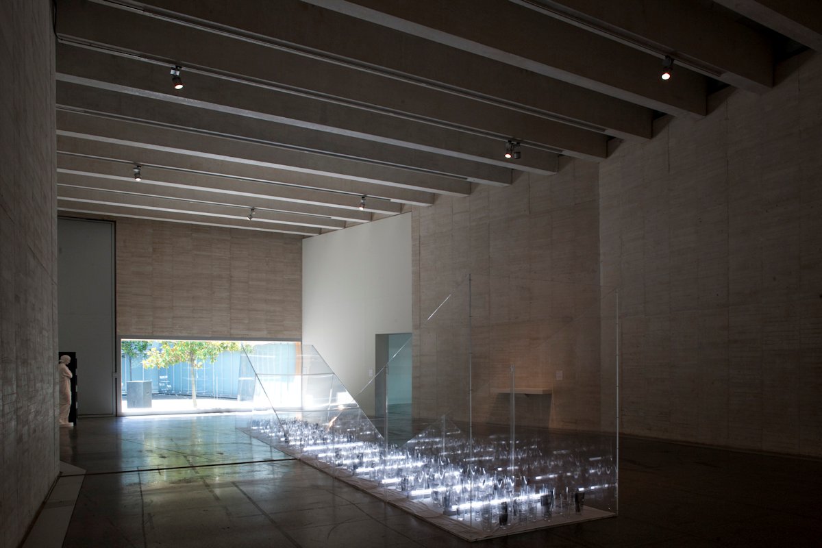 ![]() 1988 | 47 años Caja de cotidianidad Caja de metacrilato, vasos, módulos de mármol, tubos fluorescentes y periódicos. Colección particular 11 x 2.20 x 1.70 m. | ![]() 2014 | 73 años Interferencias en los medios Papeles de periódico y vasos de vidrio. Colección particular |