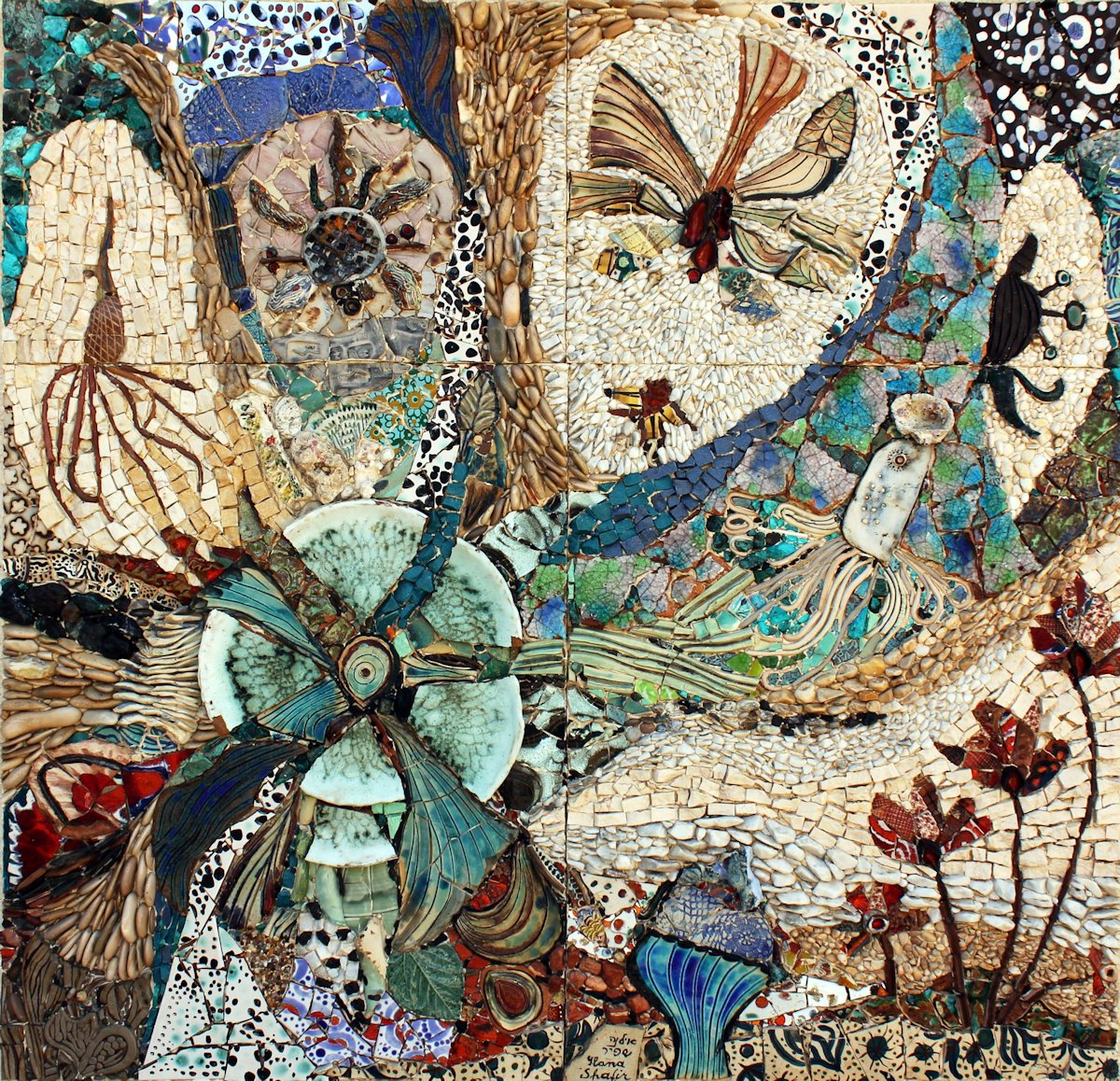 Biografía: Mosaiquista israelí nacida en Sarajevo, antigua Yugoslavia. Estudiaba Arquitectura en la escuela secundaria, cuando sus estudios se vieron interrumpidos por la invasión nazi de Yugoslavia. La familia huyó al sur del país, bajo dominio italiano. Ilana comenzó a pintar los paisajes del pequeño pueblo de Kula, donde se había refugiado. Con un aspecto visiblemente diferente al de los lugareños, era evidente para todos, incluidos los soldados italianos y, posteriormente, los alemanes y sus comandantes, que su familia no pertenecía al pueblo. Si alguien hubiera revelado su verdadera identidad, se habrían perdido, pero sobrevivieron gracias a que ni un alma, ni niño ni adulto, mencionó siquiera la palabra "judío". Después de la guerra, pudo comenzar sus estudios en la Academia de Arte de Zagreb, donde se graduó en 1949. Poco después, la familia emigró a Israel para establecerse finalmente en Ascalón, que por aquel entonces era un pequeño asentamiento de apenas unas pocas familias. Comenzó a pintar y dibujar recién llegados a un campo de tránsito cercano. Este período creativo culminó con exposiciones en Israel, Holanda y Suiza. La obra de este período refleja la tristeza y el sufrimiento de los judíos. A principios de los años 60, dejó de sentir la necesidad de representar rostros judíos tristes y comenzó a buscar una nueva dirección y medios de expresión. Fue entonces cuando empezó a trabajar con mosaicos y acuarelas. Trabajó en pequeños proyectos de mosaicos, pero rápidamente le llegaron encargos más grandes, tanto públicos como privados. Durante este tiempo, hubo periodos de intensa pintura en acuarela, así como exposiciones de estas obras. Ilana, sin embargo, siempre volvió al mosaico. Ambas técnicas, a pesar de sus diferencias, se influyeron mutuamente de forma creativa. Al mismo tiempo creó esculturas de cerámica que reflejan otra faceta de su creatividad. Durante años también fue una dedicada profesora de arte y, posteriormente, fundadora y directora del Centro de Arte de Ascalón, una próspera institución educativa con estudios multimedia que ofrecía educación artística a estudiantes y adultos. Desde 1980 participaría activamente en la creciente comunidad de artistas del mosaico en todo el mundo y fue invitada frecuentemente como ponente en congresos nacionales e internacionales de mosaico. Su obra ha sido reconocida en todo el mundo. © I.S. Web Recomendada: shafirart.com |