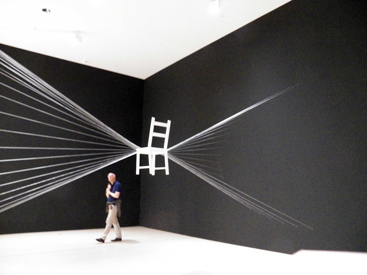 Pintura negra, hilo blanco y silla de madera.