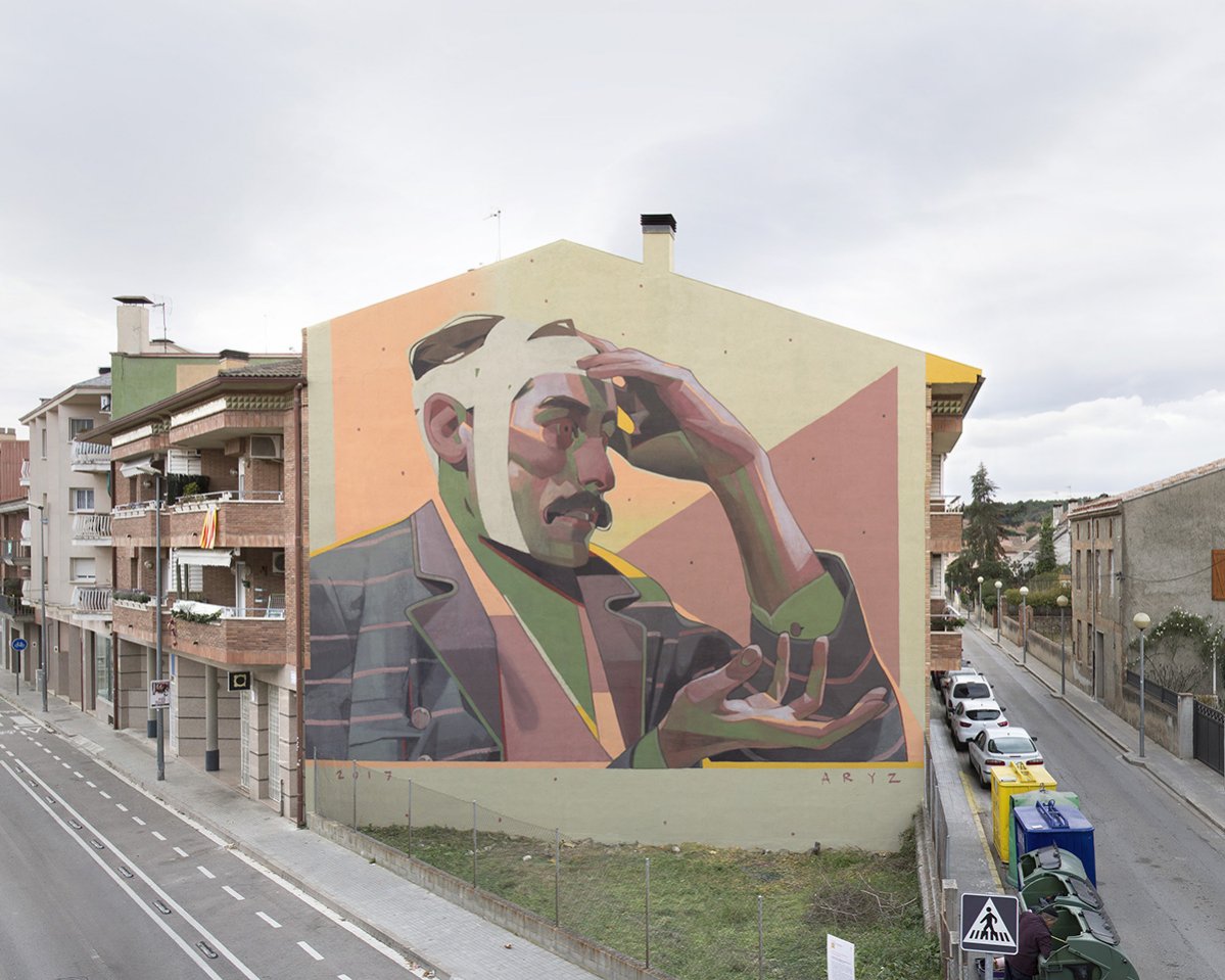 Biografía: Artista, muralista e ilustrador catalán nacido en Palo Alto, EEUU, conocido con el nombre artístico de Aryz. Empezó su trayectoria artística como grafitero y más tarde estudió Bellas Artes en la Universidad de Barcelona. Su interés por el arte no es casual, puesto que proviene de una familia que tiene vínculos con este gremio. Hacia el año 2000 empezó a pintar en zonas poco transitadas y espacios abandonados sólo por divertirse. Más tarde, su trabajo ganó notoriedad y reconocimiento, y empezó a participar en festivales de arte urbano en todo el mundo. La primera invitación para realizar un mural de gran formato le llegó de Italia en 2010. Actualmente vive y trabaja en Cardedeu, pero viaja a menudo con motivo de los proyectos que le encargan en el extranjero. En 2019 fue artista invitado del Museo de Bellas Artes de Nancy, y se expusieron dibujos, esbozos y grabados suyos, y en 2022 se presenta en Bolonia su primera exposición que se hace Italia, en la que expone tres obras de gran formato y litografías hechas expresamente para esta exposición. Sus murales se caracterizan por sus grandes dimensiones y porque plasman personajes, escenas cotidianas y paisajes compositivos. No le gusta intervenir en el espacio de forma agresiva, tiene muy en cuenta el entorno y sus colores a la hora de producir las obras. Hay un buen número de países donde hay obras suyas, entre ellos, Alemania, Austria, Estados Unidos, Finlandia, Francia, Italia, Japón, Marruecos, Países Bajos, Polonia, Venezuela, y China. Aunque sus producciones son siempre a gran escala, Aryz nunca utiliza proyector ni cuadrícula a la hora de realizar sus murales. Inicia el proceso creativo pintando formas generales y, una vez quedan encajadas donde él desea, las va definiendo poco a poco. Se trata de un procedimiento similar al del modelado en la producción de una escultura. Así, en su técnica se puede reconocer el esfuerzo por encontrar un sentido espacial de la composición y de la proporción arquitectónica que el espacio ya existente pueda integrar. Aryz considera sus obras un “diálogo del artista con la pared” que, por encontrarse en un espacio público, pueden considerarse una obra efímera. Además de sus obras en el espacio público, también trabaja en su estudio, donde realiza obras de pequeño formato. © WK Web Recomendada: www.aryz.es |