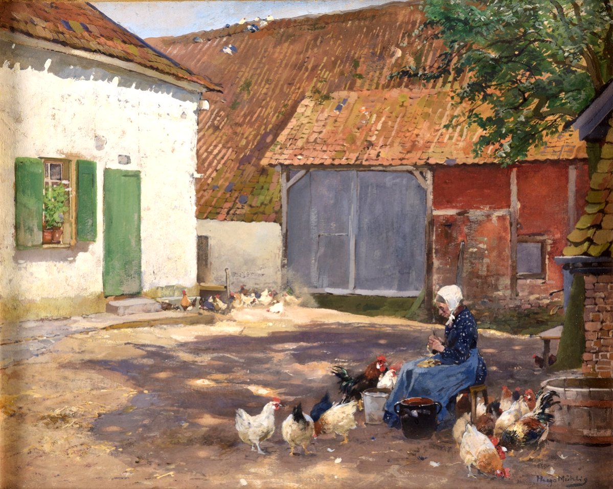 Biografía: Pintor paisajista alemán nacido en Dresde. Desde 1881 vivió en Düsseldorf como pintor de paisajes y escenas de género. Era hijo del pintor de paisajes y escenas de género de Dresde, Meno Mühlig (1823-1873) y sobrino del pintor de paisajes y animales, Bernhard Mühlig (1829-1910). Primero aprendió pintura con su padre, después en la Academia de Arte de Dresde y de 1877 a 1880 como alumno de maestría de Viktor Paul Mohn. Si bien se mantuvo fiel al realismo de la escuela de Ludwig Richter en sus dibujos durante un período de tiempo más largo, abrió nuevos caminos en la pintura poco después de trasladarse a Düsseldorf en 1881. El carácter impresionista de sus pinturas se debe también al hecho de que los paisajes y escenas de agricultores cosechando, cazadores en campos invernales o paseantes de feria están casi siempre bañadas por la intensa luz del sol, lo que permite que los colores de los objetos brillen de forma particularmente pura. En cuanto a la composición, sus pinturas destacan por el hecho de que, desde un punto de vista ligeramente elevado, los objetos y figuras en primer plano y cerca del medio plano están particularmente acentuados y suelen agruparse en una o dos diagonales desde el punto de vista hacia el borde izquierdo o derecho del horizonte. Este claro esquema compositivo, que corresponde a una disposición algo teatral de las personas y los animales, indica que sus pinturas fueron generalmente creadas en el estudio, aunque a partir de una gran cantidad de bocetos realizados en la naturaleza, que en su mayoría eran gouaches o acuarelas. De 1883 a 1891 viajó regularmente a Willingshausen in der Schwalm para tomar estas impresiones y se convirtió en miembro de la colonia de pintores de la asociación de artistas Willingshausen. En Düsseldorf fue miembro de la asociación de artistas Malkasten desde 1887 hasta su muerte y desde 1891 en la secesionista Freie Vereinigung Düsseldorfer Künstler. Dado que Hugo Mühlig no era un pintor académico, apoyado por encargos públicos, sino un artista independiente para el mercado del arte, muchas de sus pinturas siguen siendo de propiedad privada. © WK |