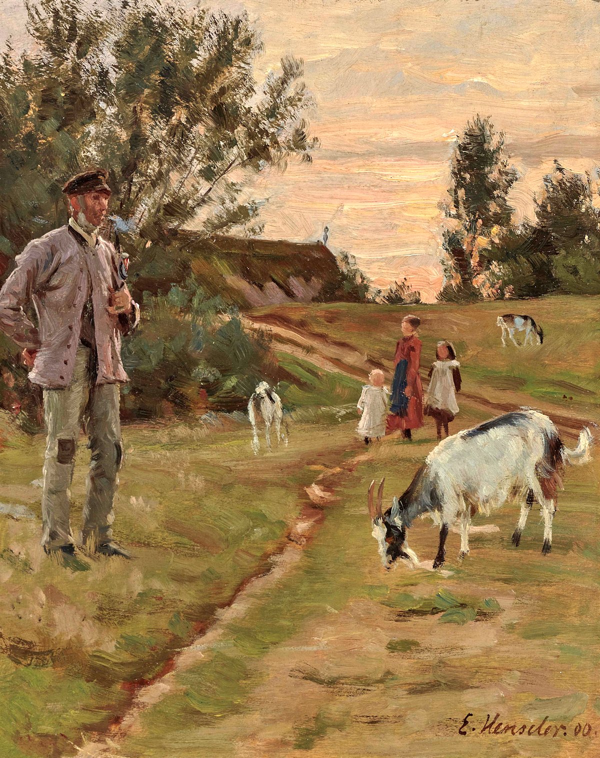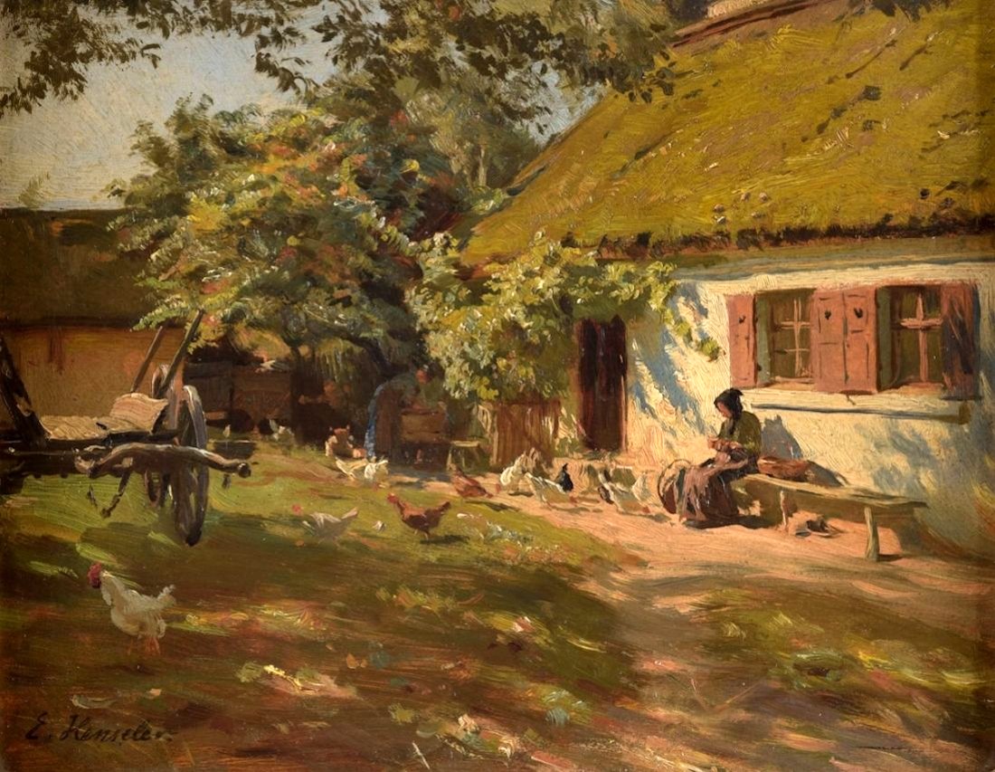 Biografía: Pintor alemán nacido en Wepritz. Tercero de siete hijos de un granjero en Warthebruch, estudió en la Real Escuela de Arte de Berlín y más tarde Arte Académico en la Escuela de Arte Gran Ducal Sajona de Weimar de 1871 a 1877. Como alumno de Karl Gussow, Albert Bauer y Albert Brendel, se formó para convertirse en un excelente pintor de género y retratos. Las pinturas de esta época se pueden encontrar en el Palacio Fallersleben, la Galería Nacional de Berlín, el Museo Bomann de Celle y las Colecciones Gráficas de Weimar. Desde 1878 fue profesor en varias escuelas de arte y desde 1881 enseñó en el instituto de enseñanza del Museo de Artes y Oficios de Berlín. Muchos pintores, dibujantes e ilustradores de todo el mundo que fueron sus alumnos se hicieron famosos en sus respectivos campos. El propio Henseler, que trabajó como profesor de arte, pintor y dibujante durante su etapa creativa, era considerado un artista muy conocido y, sobre todo, muy popular en toda Alemania, como lo demuestran las numerosas publicaciones de la época con ilustraciones de sus obras, en su mayoría en forma de xilografías. Durante sus estancias anuales de verano en su tierra natal, Henseler pintaba principalmente motivos de la vida rural, retratos y también cuadros históricos. Desde 1877 participó en las exposiciones de la Academia de Berlín y hasta 1926 en las principales exposiciones de arte de Berlín. Ernst Henseler murió en 1940 a la edad de 88 años. © WK |