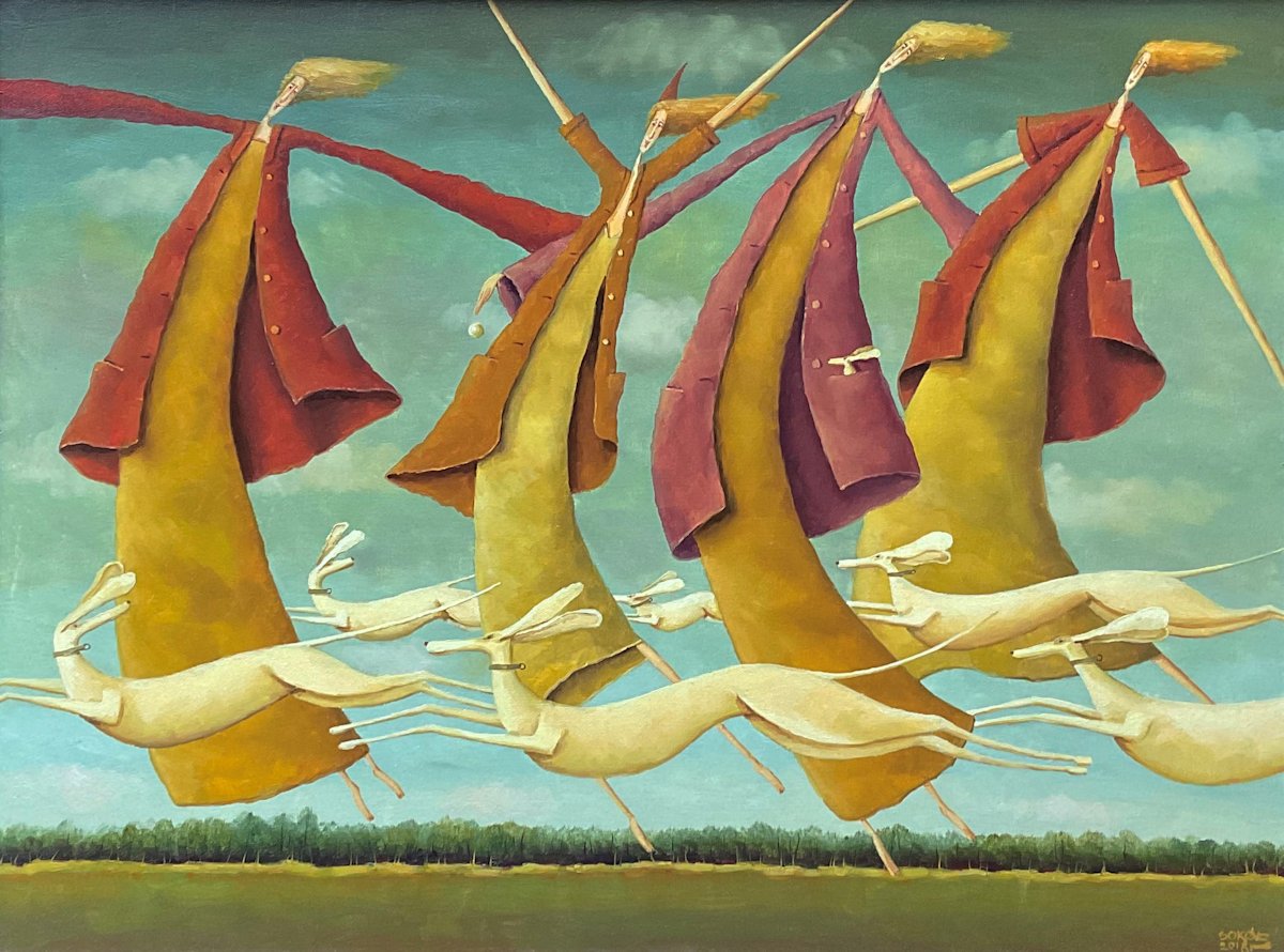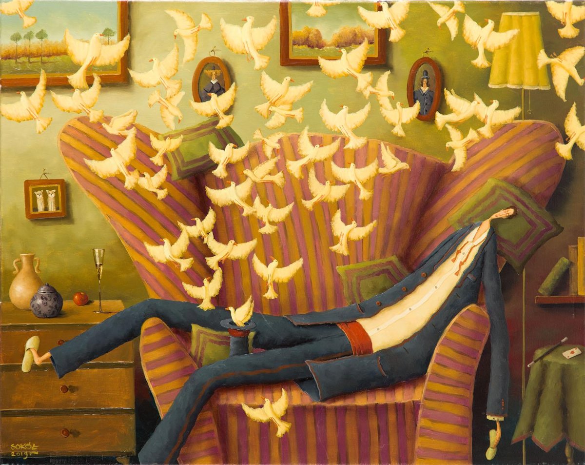 Biografía:  Pintor polaco nacido en Varsovia. Se graduó en la Academia de Bellas Artes de Varsovia, donde se centró en el diseño de interiores y el arte gráfico. Sin embargo, su pasión por la pintura acabó por imponerse a sus otros intereses artísticos. Su viaje de descubrimiento de su propio camino creativo personal siempre se ha inspirado en las pinturas de los artistas europeos de los siglos XIV al XVII. Su fascinación por las pinturas del siglo XVII de los maestros holandeses le llevó inicialmente a pintar composiciones de naturalezas muertas al estilo holandés. Sin embargo, su estudio constante de las técnicas de los antiguos maestros en general le llevó en los últimos años a quedar completamente fascinado por las obras figurativas del Renacimiento italiano temprano, cuya influencia se puede ver fácilmente en su obra corporal actual. Sus pinturas se caracterizan por composiciones asimétricas, figuras alargadas y un uso simple pero monumental de la línea. Con una paleta de ricos y coloridos burdeos, dorados, verdes y rojizos, Sokól coloca sus figuras alargadas en paisajes surrealistas y encantados que son interpretaciones físicas de un mundo de ensueño. Sus figuras inmediatamente reconocibles flotan, vuelan, se balancean y bailan, encarnaciones despreocupadas de emociones y deseos en un mundo alegre, mágico y romántico. Las pinturas alientan al espectador a regresar y aprovechar al máximo los momentos lúdicos y alegres en los que reinan la risa, el amor y el afecto. Al intentar definir su trabajo, el artista se refiere a sus pinturas como "realismo metafísico". En varias reseñas y publicaciones, las obras han sido descritas como "altamente intelectuales y filosóficas", "iluminadas por una fuente invisible de luz" y "con temas de una perspectiva deliciosamente distorsionada". En 2005, Sokól recibió una importante subvención del Ministerio de Cultura y Patrimonio Nacional de Polonia. Desde 1985 ha sido honrado con varias exposiciones individuales en Polonia, Alemania y Estados Unidos y ha estado representado en más de 30 exposiciones colectivas en museos, instituciones de arte y galerías en Polonia, Alemania, Italia, Francia, Estados Unidos y Japón. © L.S. Web Recomendada: www.lsokol.com  |