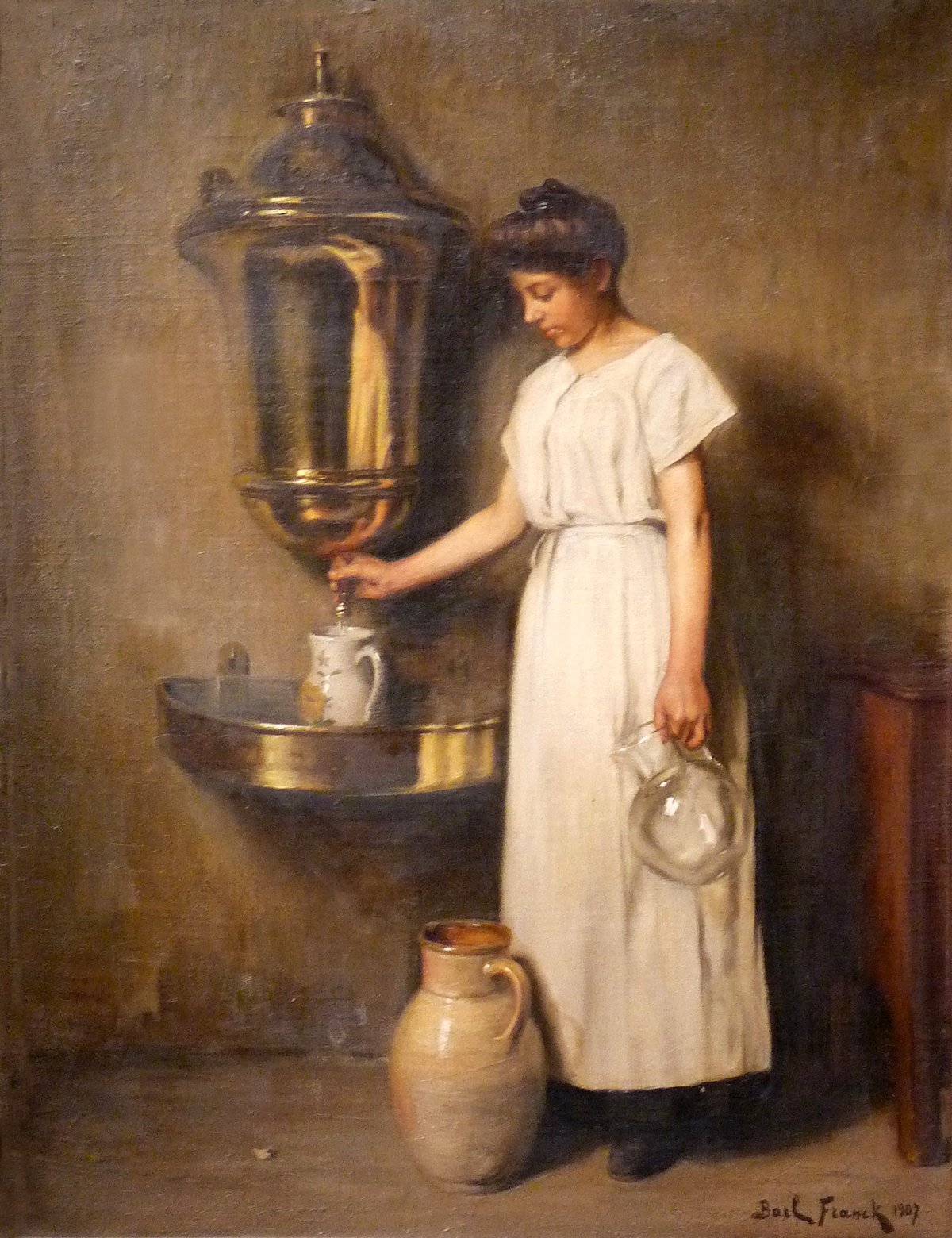 Biografía: Pintor francés nacido en París. Hijo mayor del pintor Antoine-Jean Bail (1830-1919), Franck-Antoine, al igual que su padre y su hermano menor Joseph (1862-1921), pintó escenas de género, bodegones y paisajes de la región de Fontainebleau. También realizó retratos, por los que se forjó una sólida reputación. Estudió con su padre y en el taller de Jean-Léon Gérôme, y comenzó a exponer en el Salón de los Artistas Franceses en 1878. Recibió una mención honorífica en el Salón de París en 1889. Aunque quizás no tan conocido como su hermano Joseph, su reputación está bien establecida entre los pintores de género de finales del siglo XIX. Al igual que Théodule Ribot, su hija Louise y su hijo Germain, otra familia de pintores realistas del siglo XIX, los Bail trabajaron en París, donde tenían estudios en la isla de San Luis. El primero, en el número 17 del quai d'Anjou, en el hotel Lauzun, contaba con una espaciosa cocina que servía de magnífico fondo para sus pinturas de cocineros, pinches de cocina y limpiadores de vajillas de cobre. Cuando no estaban en París, los tres artistas se mudaban a Bois-Le-Roi, cerca de Fontainebleau, donde pasaban los veranos y buscaban otros temas para sus lienzos, como estudios del bosque de Fontainebleau o escenas de género que representaban temas rurales. © Rehs |