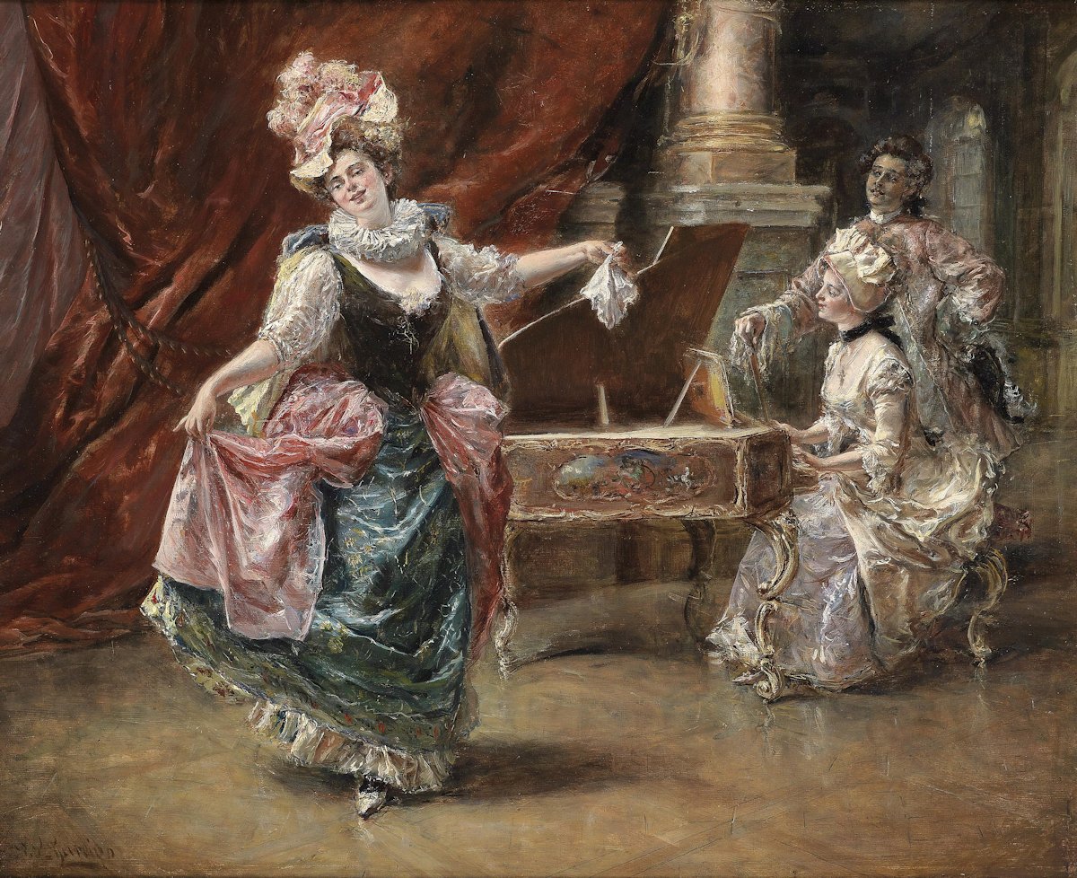 Biografía: Pintor costumbrista español nacido en Madrid, especializado en la reproducción de escenas de baile en salones rococó y retratos femeninos. Fue profesor de la Escuela de Artes y Oficios de Varennes (Francia). Comenzó su formación en la Escuela Superior de Pintura de Madrid y en el taller de Vicente Palmaroli, con el que viajó a Roma y más tarde a París. En 1875 le fue concedida una pensión de la Diputación de Madrid para trasladarse a la capital francesa, donde acudió al taller de Raimundo de Madrazo. Realizó numerosos viajes a Venecia en compañía de los Madrazo, Mariano Fortuny y Martín Rico. Concurrió a los Salones parisinos desde 1876, a las Nacionales de Bellas Artes y a las exposiciones de Londres y Múnich. Contó con un gran éxito de crítica y público. Murió en Caen, Francia, en 1949. © Museo del Prado |