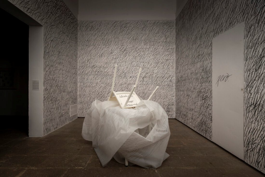 2024 | 83 años Inter-acciones Mesa y silla con papel envolvente. Colección particular |