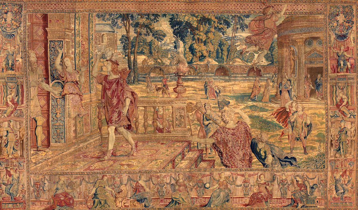 1570 | 50 años Cécrope da la bienvenida a Mercurio Tapiz (Lana, oro, plata y seda) Museo del Prado. Madrid 430 x 550 cm. |