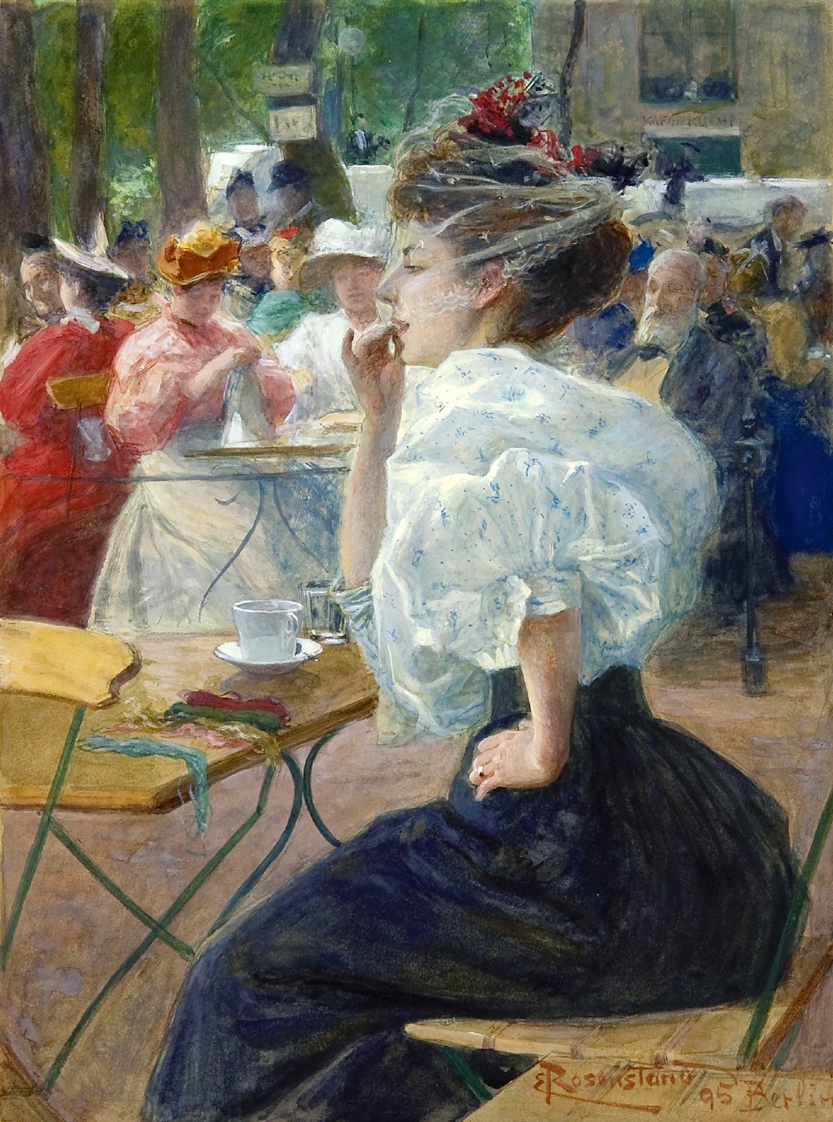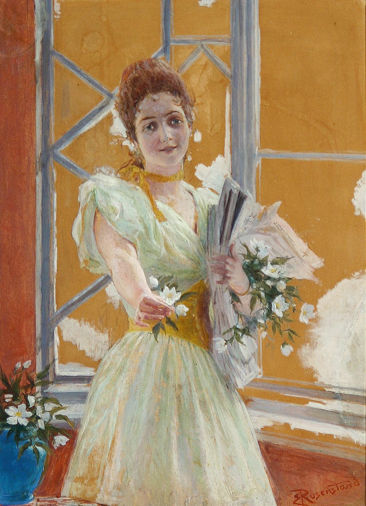 Biografía: Artista danés que representó imágenes de hermosas mujeres llenas de la alegría de su tiempo en sus numerosas pinturas, ilustraciones y dibujos. Rosenstand comenzó su formación como escultor cuando, como muchos otros creadores daneses, asistió a la Real Academia de Bellas Artes de Copenhague. Sin embargo, durante sus estudios, comenzó a darse cuenta de que su verdadera pasión residía en la pintura y el dibujo. Tras finalizar sus estudios se trasladó a Berlín. Allí encontró trabajo en la publicación The Flying Pages, una revista satírica semanal, que se dirigía y se burlaba del público burgués de clase media y de toda su opulencia y humor. Rosenstand comenzó a representar figuras predominantemente femeninas con sus mejores galas. En sus ilustraciones más cómicas, la moda de estas damas cobraba vida propia. Las mangas abullonadas se convierten en globos, los cuellos puntiagudos sobresalen como las alas de un pájaro en vuelo. Sin embargo, Rosenstand también comenzó a cultivar una inclinación por capturar la belleza de estas mujeres y, además, cómo esta belleza se infundió y formó parte del espíritu de la época. La Alemania de finales del siglo XIX era una en la que abundaban las promesas de auge económico y desarrollo social. El káiser Guillermo II deseaba una Alemania tan floreciente como la de otros países europeos durante esta Belle Epoque. Las representaciones femeninas de Rosenstand encierran esta promesa de prosperidad en las sonrisas fruncidas de sus bocas y el alegre rubor de sus mejillas. En sus pinturas, sus vestimentas no son cómicas, sino elegantemente ajustadas a sus cuerpos, haciéndolas parecer gráciles cisnes. Llenan el lienzo con un efusivo despliegue de finas telas mientras asisten a eventos sociales o salen con un pretendiente. En pinturas más sobrias, hay un realismo que no resta alegría, sino que parece comprender más a nivel emocional. Una mujer sonríe, inundada por un fondo negro que resalta su belleza y, sobre todo, su felicidad. También en pinturas posteriores, una vez finalizado el reinado del Káiser y cuando las promesas parecían no haberse cumplido del todo, Rosenstand conserva la belleza que impregnaba sus obras anteriores, a la vez que las fundamenta en el realismo. Una mujer realiza sus tareas cotidianas, la arquitectura que la rodea luce sombría, pero ella, vestida con una elegante tela azul, su piel pálida, casi luminosa. Rosenstand se forjó una reputación por capturar el espíritu de la época, impregnado por la burguesía. Vivió y trabajó en Alemania hasta su muerte en 1932. Hoy en día, muchas de sus ilustraciones para The Flying Pages se pueden encontrar en los archivos en línea que preservan estos importantes objetos de una sociedad desaparecida. © Brave |