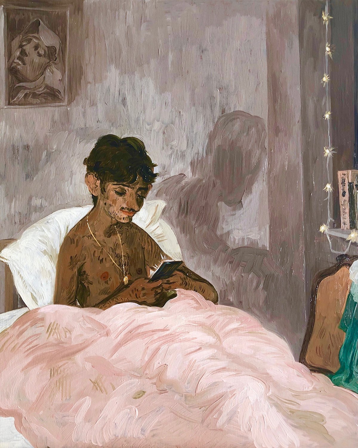 Biografía: Artista pakistaní nacido en Lahore. Las suntuosas y perspicaces pinturas figurativas de Salman Toor representan momentos íntimos y cotidianos en la vida de hombres jóvenes, morenos y queer imaginarios. Su obra oscila entre lo alentador y lo desgarrador, lo seductor y lo conmovedor, lo atractivo y lo inquietante. En muchas de sus pinturas, crea representaciones sutilmente cautivadoras de entornos domésticos familiares en los que cuerpos a menudo marginados prosperan en seguridad y comodidad. En otras piezas crea espacios alegóricos de espera, anticipación y aprensión; cruces de fronteras hacia un mundo que puede o no ser acogedor. Las ansiedades y las comedias de la identidad son centrales en su obra. Al representar los momentos mundanos y memorables de la vida de sus personajes, revela una existencia profundamente cercana, creando en última instancia una oportunidad para la empatía a través del lenguaje de la pintura. Su obra se encuentra en las colecciones permanentes del Metropolitan Museum of Art, Nueva York; Whitney Museum of American Art, Nueva York; The Morgan Library and Museum, Nueva York; Walker Art Center, Minneapolis; High Museum of Art, Atlanta; Tate, Londres; Courtauld Gallery, Londres; Moderna Museet, Estocolmo y en la Pinault Collection de París, entre otros. Salman Toor vive y trabaja en Nueva York. © Thomas Dane Gallery |