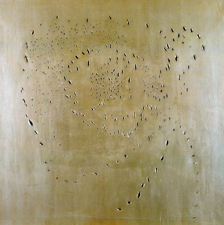 ![]() 1952 | 53 años Concepto espacial Óleo y lentejuelas sobre papel entelado. Fondazione Lucio Fontana 77 x 77 cm. | ![]() 1960 | 61 años Concepto espacial Óleo sobre lienzo. Colección particular 200 x 200 cm. |