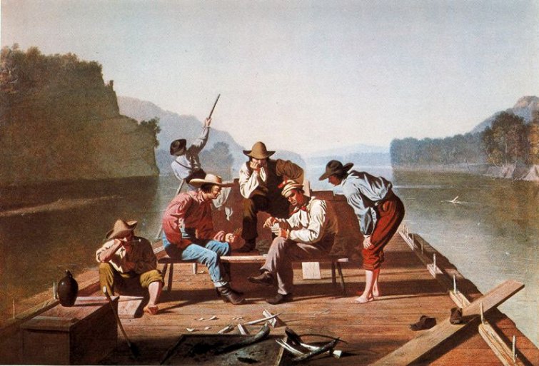![]() 1845 | 34 años Traficantes de pieles descendiendo el Missouri Óleo sobre lienzo. Metropolitan Museum. Nueva York 73.7 x 92.7 cm. | ![]() 1847 | 36 años Balseros jugando a las cartas Óleo sobre lienzo. St. Louis Art Museum 71.12 x 91.44 cm. |