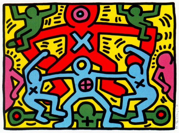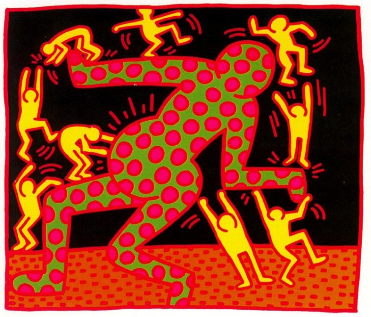 Biografía: Pintor estadounidense cuyos sencillos dibujos, que parecen representar animales y figuras danzando, le dieron fama internacional en la década de 1980. Nació en Kutztown, Pennsylvania. Estudió en el Ivy School of Professional Art de Pittsburgh, Pennsylvania, y expuso sus trabajos por primera vez en el Pittsburgh Center for the Arts en 1978. En 1977, tras asistir a una conferencia del artista estadounidense de origen búlgaro Christo sobre sus proyectos artísticos ambientales a gran escala, comenzó a crear arte para espacios públicos. En 1978 se trasladó a Nueva York, donde tomó clases en el School of Visual Arts desde 1978 hasta 1979. Haring se interesó vivamente por las líneas negras de los graffiti que artistas como el estadounidense Jean-Michel Basquiat dibujaban en el metro, un tipo de expresión artística que empezaba a ganar aceptación en las galerías de Nueva York. En 1979 utilizaba recortes de periódicos para crear falsos titulares y en 1980 empezó a pintar graffiti en el metro y en otros muchos lugares. Empleaba imágenes como un perro ladrando, platillos volantes que emitían rayos luminosos y lo que él mismo denominaba su “bebé radiante”, un bebé sin cara rodeado de líneas luminosas, que se convirtió en su firma. Dibujaba estas imágenes con un rotulador negro grueso o con tiza blanca sobre el fondo oscuro de los carteles de las estaciones de metro. Aunque estas obras le hicieron famoso, fue arrestado en varias ocasiones por dañar la propiedad pública. Al tiempo que realizaba estas pinturas callejeras, creaba también obras para exponerlas en importantes galerías. La exposición que presentó en 1982 en la prestigiosa Tony Shafrazi de Nueva York tuvo un enorme éxito y supuso el lanzamiento definitivo de su carrera. Como creador, Haring se inspiraba en diversas fuentes, entre ellas el Pop Art, representado por Andy Warhol y otros artistas, en el ritmo y los movimientos de los bailes de África, de Cuba y hasta del hip-hop, y en la pintura corporal afrocubana. Sus murales cubren las paredes de muchos lugares de Estados Unidos, Europa y Australia. Murió en 1990 víctima del SIDA. © M.E. |