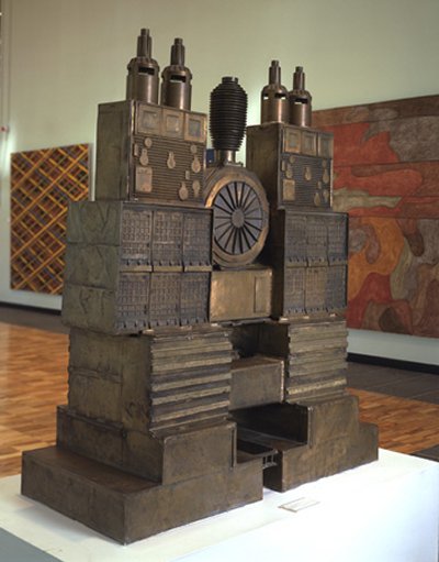 Biografía: Escultor escocés, pionero del Pop Art en la década de 1950 y, desde entonces, uno de los artistas británicos más destacados. De padres italianos, nació en Leith, cerca de Edimburgo, y entre 1943 y 1947 estudió en las escuelas de arte de Edimburgo y de Slade. Desde 1947 hasta 1949 trabajó en París, donde recibió la influencia del surrealismo. A su regreso a Gran Bretaña se implicó abiertamente en el desarrollo del Pop Art dentro del Independent group, ligado a los debates del Instituto de Arte Contemporáneo de Londres. La obra de Paolozzi de finales de la década de 1940 refleja el influjo del movimiento Dadá y del surrealismo, como se refleja en las formas biomórficas de sus esculturas y en el uso del collage, un medio que se convirtió en decisivo en el desarrollo del Pop Art. En la década de 1950 Paolozzi incorporó piezas de maquinaria a sus esculturas de bronce, mientras que su obra última incluye esculturas de formas abstractas gigantes, casi arquitectónicas, realizadas con extrañas combinaciones de formas mecanicistas. Entre estas composiciones cabe destacar la obra Río (1964-1965, Hunterian Art Gallery, Glasgow), una escultura de bronce fundida en seis secciones. Paolozzi también realizó algunas películas, fue comisario de varias exposiciones y diseñó los mosaicos (1980-1983) para la estación de metro (subterráneo) de Tottenham Court Road en Londres. El éxito de Paolozzi radica en la creación de un estilo personal distintivo, a pesar de pertenecer a la generación de escultores dominados por el ejemplo de Henry Moore. Su otra vertiente profesional fue la enseñanza, que ejerció en Gran Bretaña, Alemania y Estados Unidos. © M.E. |