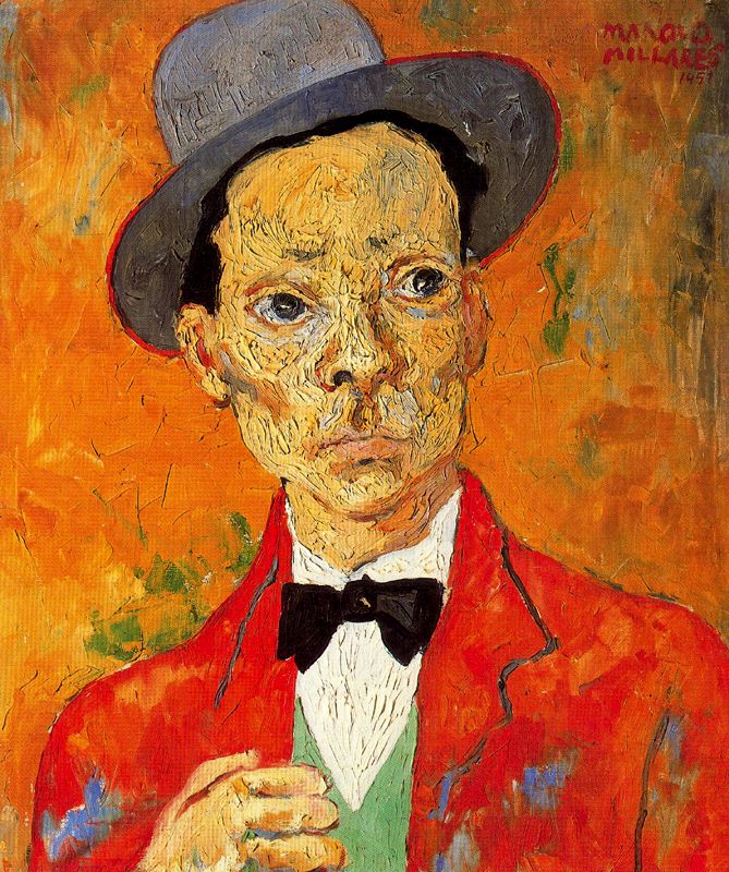 Biografía: Pintor español nacido en Las Palmas de Gran Canaria. Su estancia en Lanzarote, durante la Guerra Civil española (1936-1939) le hace tomar contacto con la naturaleza, que le influirá en su obra. Al principio, es el surrealismo quien ejerce en él gran influencia, de esta época (1949) datan sus primeros Pictogramas. Más tarde traba amistad con la escuela de Altamira y es uno de los colaboradores de LADAC (Los Arqueros del Arte Contemporáneos). Después de ahondar en la idiosincrasia canaria como temática de sus obras, pasa a investigar las superficies, la materia y las texturas. A partir de ahí elaborará sus arpilleras, donde combina arena y madera. En el año 1955 realiza sus Perforaciones. Participa en la creación del grupo El Paso, que influiría de forma decisiva en la difusión del informalismo español o abstracción expresiva. El viaje que realiza al Sahara en el año 1969, cuyo ambiente le influye en su concepción de la pintura, da como resultado un predominio del blanco de la arena especialmente. A esta fase le sigue otra titulada Antropofaunas y Neardentalios, serie compuesta por seres metamorfoseados y convertidos en fantásticos. Millares crea superficies pictóricas, de volúmenes casi escultóricos, que provocan en el espectador una intensa reacción emocional. Su obra, dentro del más puro informalismo, se exhibe en numerosos museos de todo el mundo como el Museo de Arte Moderno de Nueva York (MOMA), la Tate Gallery de Londres o el Museo de Arte Abstracto Español de Cuenca. © M.E. |