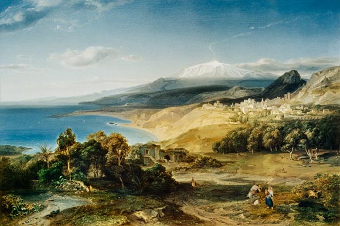Biografía: Pintor alemán, figura señera de la pintura de paisaje romántica. Procedente de una familia de artistas, recibió de manos de su padre sus primeras lecciones de pintura, antes de marchar a Múnich, ciudad donde se instalaría en 1822, contrayendo dos años después matrimonio con su prima Friedericke, hija de su tío, el influyente arquitecto de jardines Friedrich Ludwig von Sckell. Bajo el patrocinio del rey Luis I de Baviera, realizará dos ambiciosos viajes, el primero a Italia y el segundo a Grecia, con la finalidad de pintar sendos ciclos de paisajes. Su cuadro más representativo, ‘Taormina con el Etna’ (1829), fue realizado durante el viaje a Italia, y en él se aprecian bien las características de la pintura de su autor: un claro gusto por los paisajes de la antigüedad clásica, donde los temas heroicos y míticos del mundo grecorromano aparecen implícitamente evocados en el paisaje; un componente fuertemente literario, presente ya en el propio título de la obra, y en cuyos nombres (la mítica Taormina, el volcán Etna) resuenan tiempos pasados; una tendencia a idealizar el paisaje, que en cualquier caso es de un verismo casi fotográfico gracias al virtuosismo técnico desplegado; un estudio sobre el color tendente a resaltar las posibilidades de una atmósfera siempre cambiante. Falleció a los 53 años de edad. © José Antonio Bielsa |