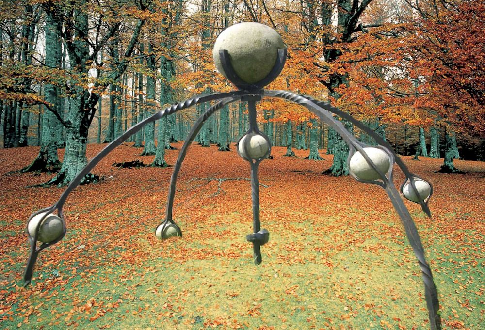 Esferas de piedra y hierro forjado.