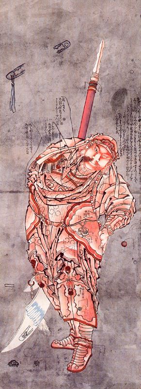 ![]() 1830 | 70 años La gran ola de Kanagawa Silografía policroma. Metropolitan Museum. Nueva York 25 x 37 cm. | ![]() 1835 | 75 años Guerrero chino con alabarda Tinta sobre papel. Colección Ichimura Tsugio. Obuse 74 x 29.5 cm. |